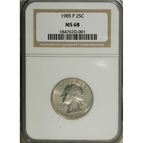<B>1985-P 25C MS68 NGC.</B></I> Sparkling luster adheres to pristine surfaces that display just a whisper or two of gold color. A sharp strike is noted on the design elements.<BR><BR><b>Shipping:</b> Coins & Currency (<a target="_blank" href="http://www.heritageauctions.com/common/shipping.php">view shipping information</a>)