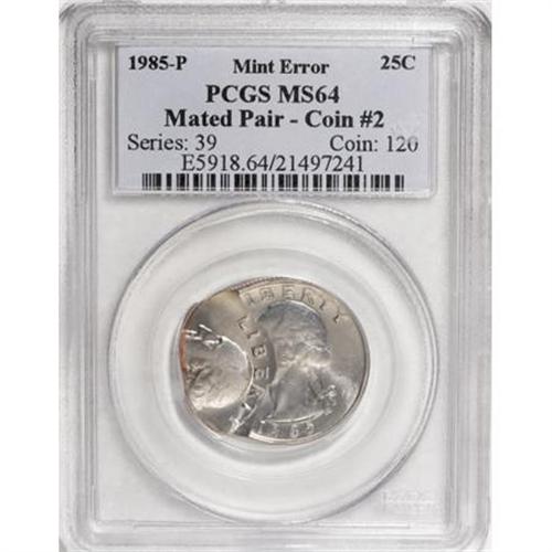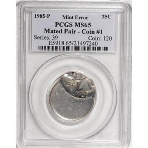 <B>A Mated Pair of Error 1985-P Washington Quarters.</B></I> The lot includes <B>Coin #1 MS65 PCGS,</B></I> and <B>Coin #2 MS64 PCGS.</B></I> The first strike for Coin #2 was normal, but the piece remained in the coin chamber instead of getting ejected. A new planchet was fed in (to become coin #1) and partially overlapped coin #2 for the latter's second strike. Coin #2 is double struck, the second strike 50% off center toward 6 o'clock, at 9 o'clock relative to the first strike. Coin #1 is 45% off center toward 1:30.<BR><BR><B>Coin Engraver:</B> John Flanagan<BR><BR><b>Shipping:</b> Coins & Currency (<a target="_blank" href="http://www.heritageauctions.com/common/shipping.php">view shipping information</a>)