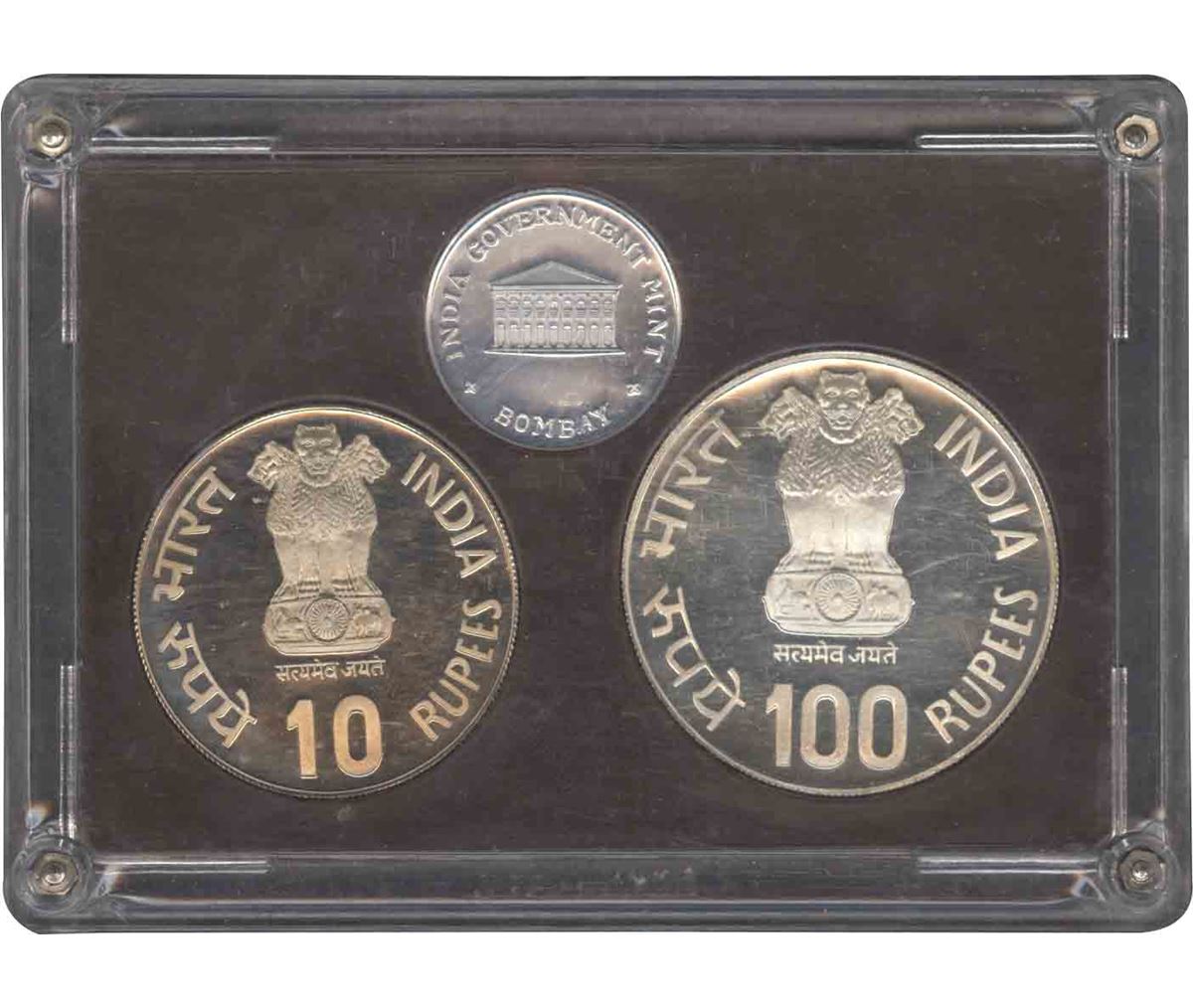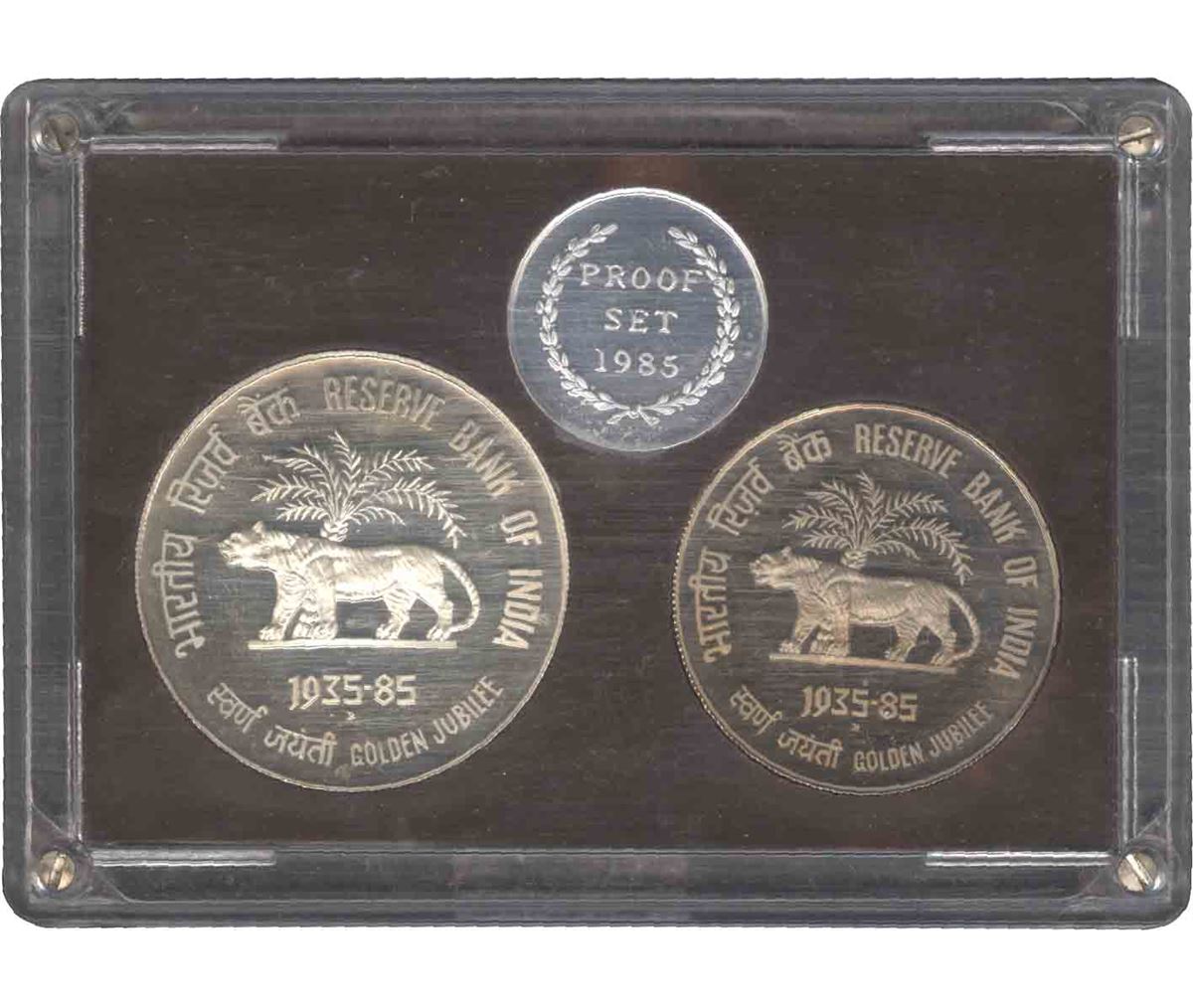 1985, Proof Set, Golden Jubilee of Reserve Bank of India, 100 Rs and 10 Rs, Bombay Mint, (RB # 104),intact condition of the certificate and cover with acrylic case, Rare.
