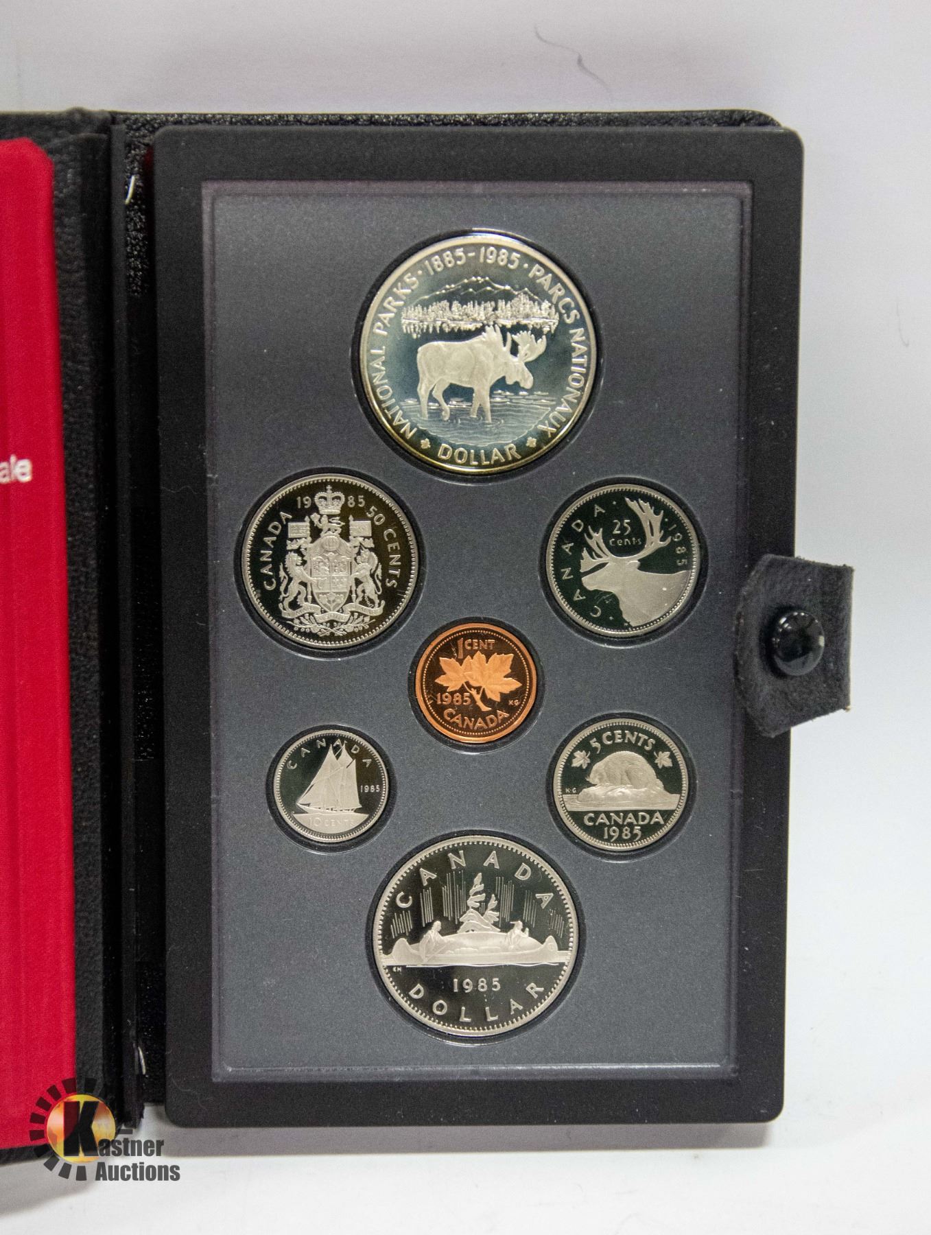 SEVEN COIN PROOF SET WITH ONE COMMEMORATIVE SILVER DOLLAR. MAPLE LEAF, BLACK CARD BOARD BOX BOOK TYPE WITH CLASP. RED SATIN INSIDE VOYAGEUR/PARKS.     **ALL ITEMS MUST BE REMOVED BY 5PM SATURDAY, FEBRUARY 10TH 2024. ALL REMAINING ITEMS WILL BE SUBJECT TO A $6.00 PER DAY STORAGE CHARGE. ANY ITEMS REMAINING AFTER MONDAY, FEBRUARY 26TH, 2023 WILL BE CONSIDERED FORFEITED. NO REFUNDS WILL BE ISSUED FOR FORFEITED ITEMS. TO SCHEDULE A PICK UP APPOINTMENT CLICK HERE