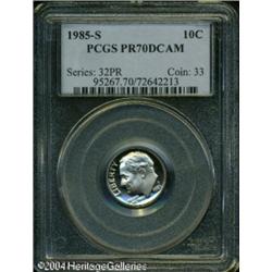 1985-S 10C PR70 Deep Cameo PCGS. The peripheries o <B>1985-S 10C PR70 Deep Cameo PCGS.</B></I> The peripheries offer a mere hint of gold color, but the devices are brilliant and display formidable contrast with the undisturbed and reflective fields. Population: 35 in 70 (11/04). <BR><BR><B>Important notice:</B> Heritage usually auctions material at the rate of 200-250 lots per hour. On some occasions eBay Live bid software or the Internet may not be able to keep up with the pace of the auction. We recommend placing a realistic absentee bid now as insurance to avoid disappointment. Occasionally the auctioneer may eliminate or reject an eBay Live bid, and the auctioneer may also reopen a lot after the close of the eBay live bidding (usually because we missed an audience bid), and may reject your bid even if it shows you as the winning bidder. By bidding via eBay Live, you agree that Heritage may award the lot to another bidder at its sole discretion under the circumstances described above or any other reasonable circumstances. Since eBay bids are not shown to us until we open the lot on the floor, we treat those bids just like floor bids. In most cases the floor responds before the eBay bid is presented to us, due to Internet lag time, so for consistency we have made it a policy that floor bids are always considered first over tie eBay live bids. Also please note that all Heritage lots purchased through eBay Live carry a 20% Buyer's Premium. Please make sure you read the Terms and Conditions before you bid. This lot is being auctioned in conjunction with a live floor auction by Heritage Galleries & Auctioneers. All final auction and invoice information will be supplied by Heritage Galleries & Auctioneers, and all other information should be considered preliminary. Lot:5861