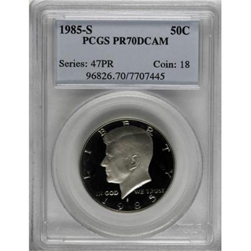 <B>1985-S 50C PR70 Deep Cameo PCGS.</B></I> PCGS Population (79/0). NGC Census: (5/0). Numismedia Wsl. Price for NGC/PCGS coin in PR70: $360. (#96826)<BR><BR><b>Shipping:</b> Coins & Currency (<a target="_blank" href="http://www.heritageauctions.com/common/shipping.php">view shipping information</a>)
