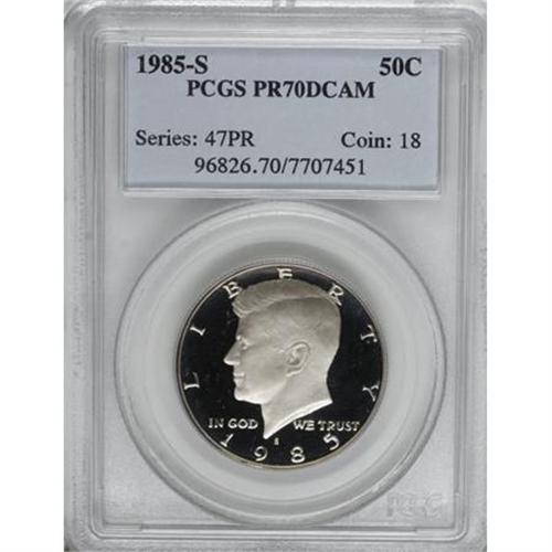 <B>1985-S 50C PR70 Deep Cameo PCGS.</B></I> PCGS Population (79/0). NGC Census: (5/0). Numismedia Wsl. Price for NGC/PCGS coin in PR70: $360. (#96826)<BR><BR><b>Shipping:</b> Coins & Currency (<a target="_blank" href="http://www.heritageauctions.com/common/shipping.php">view shipping information</a>)