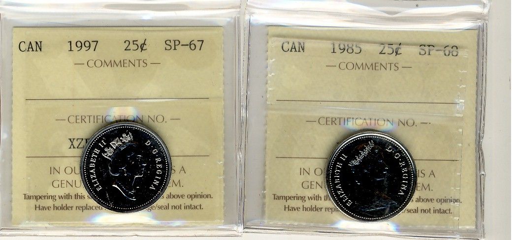 1985 SP68, 1997 25 Cents SP67; Two ICCS coins.