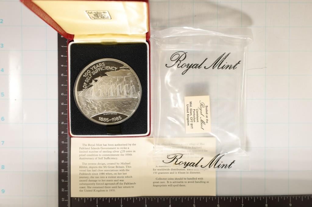 COIN FOR THE 100TH ANNIVERSARYOF SELF SUFFICIENCY OF THE FALKLAND ISLANDS. LIMITED EDITION OF 20,000. 65MM DIAMETER AND HAS A NICE SAILING SHIP ON THE OBVERSE, IN ORIGINAL MINT PACKAGING WITH CERTIFICATE