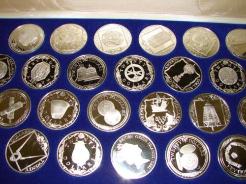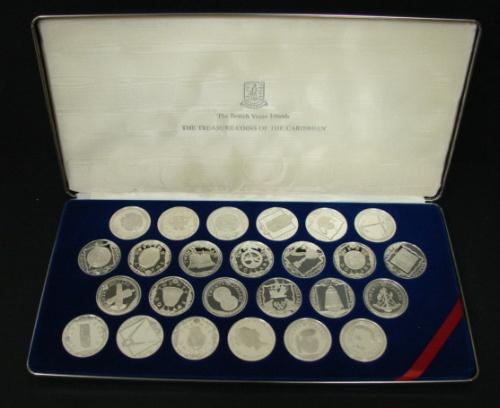 1985 BRITISH VIRGIN ISLANDS TREASURE COINS OF THE CARIBBEAN SET. Includes 25 $20 silver coins from The British Virgin Islands. Coins rest in leather case.