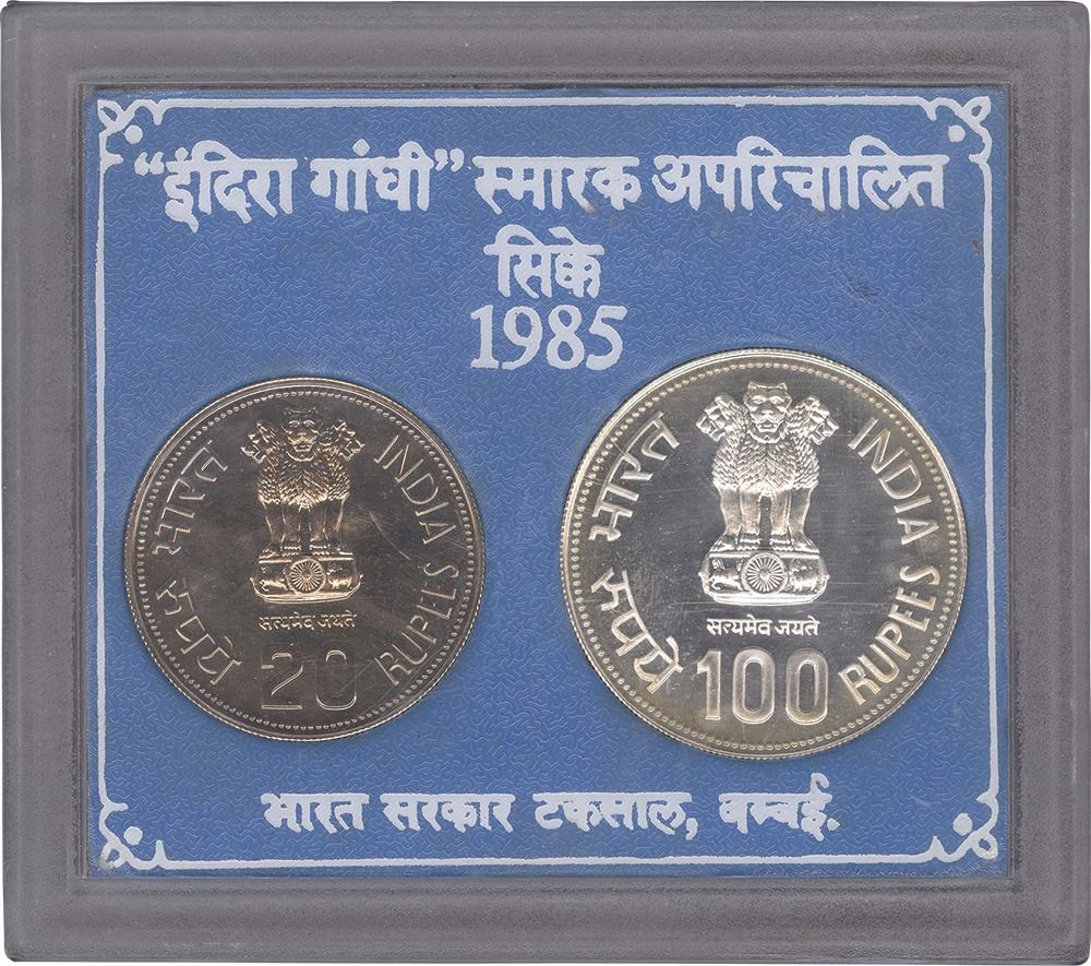 1985,UNC Set,Indira Gandhi,20 Rupees100 Rupees,BombayMint,(RB # 113), intact condition of certificate and cover with acrylic case,Rare.