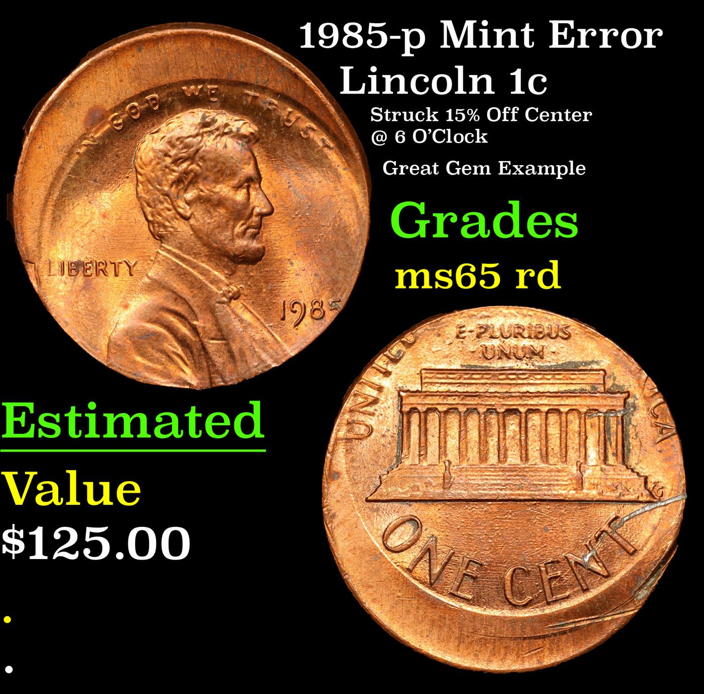 1985-p Mint Error Lincoln Cent 1c Grades GEM Unc RD.