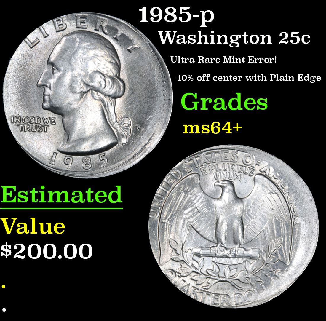 1985-p Ultra Rare Mint Error! 10% off center with Plain Edge Washington 25c Grades Choice+ Unc. A Corey's Pick, Bid to Win, Don't let it get Away Coin