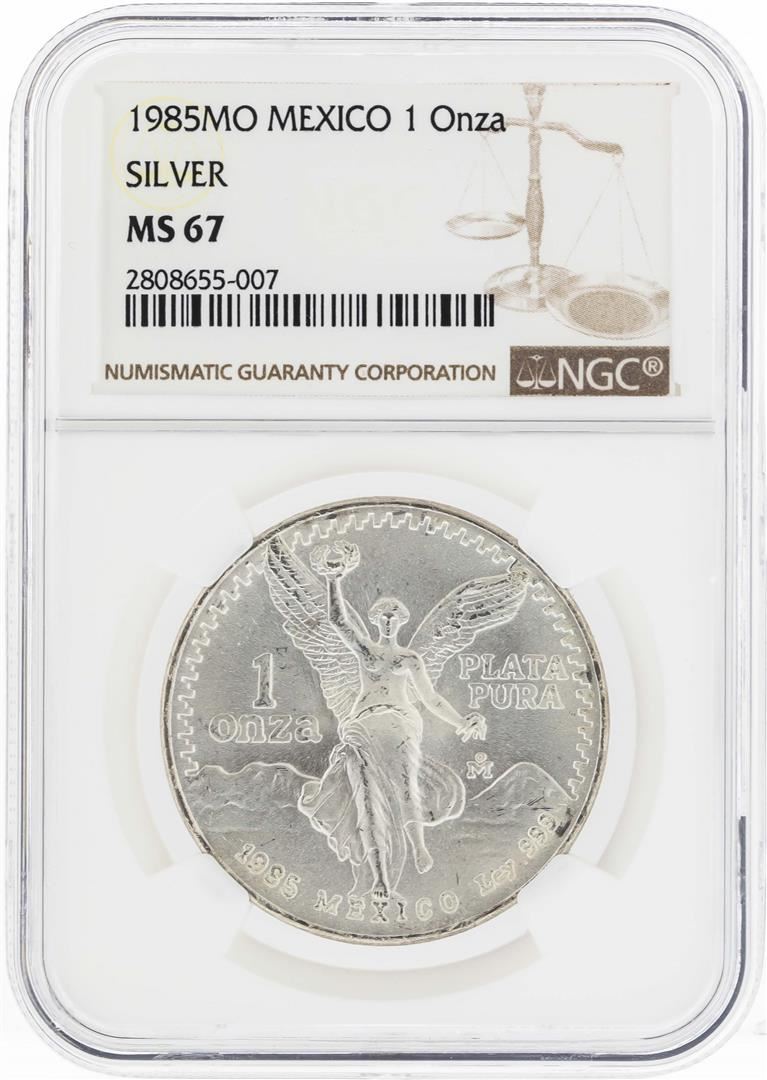 One 1985MO Mexico 1 Onza Silver Libertad Coin NGC MS67. NGC Certified.