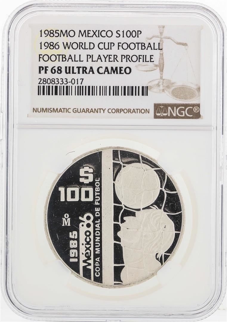 One 1985MO Mexico 100 Pesos World Cup Commemorative Silver Coin NGC PF68 Ultra Cameo. NGC Certified.