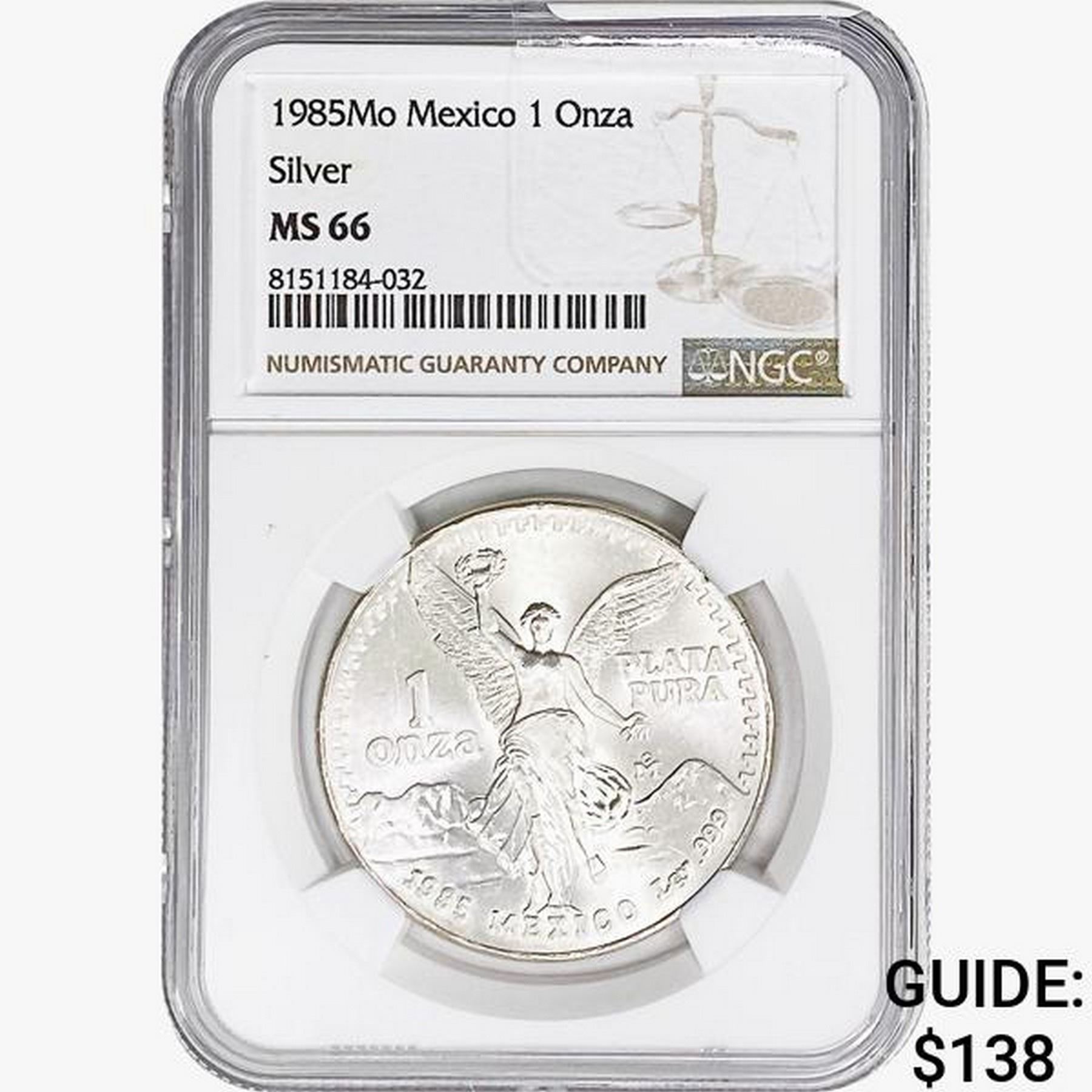 1985Mo 1oz. Silver Mexicanos Onza NGC MS66