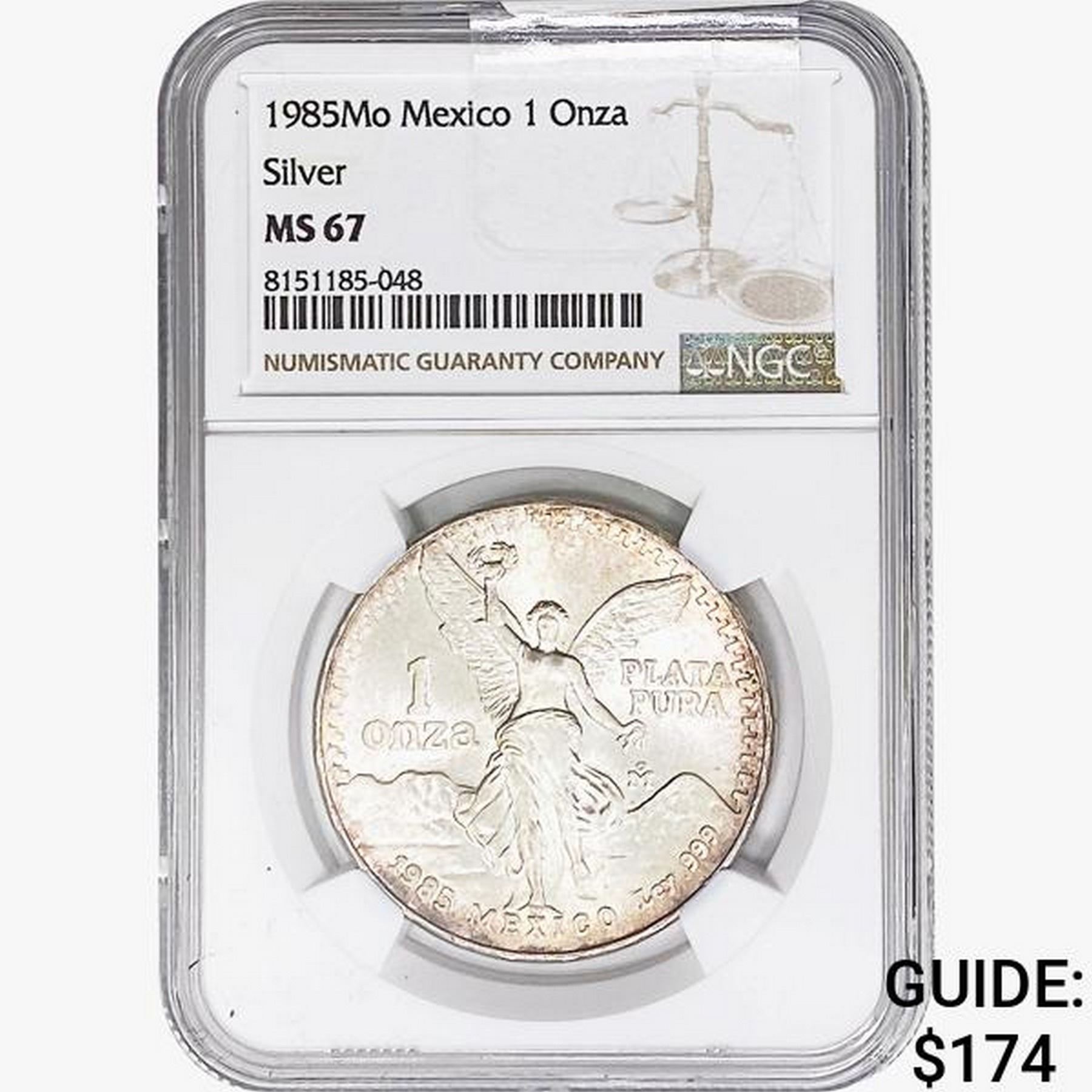 1985Mo 1oz. Silver Mexicanos Onza NGC MS67