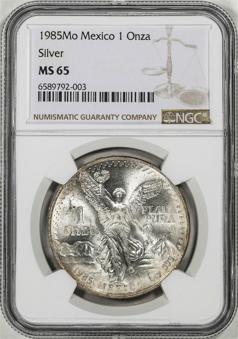 One 1985Mo Mexico 1 Onza Libertad Silver Coin NGC MS65. NGC Certified.