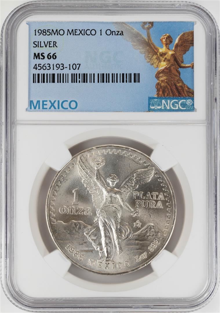 One 1985Mo Mexico 1 Onza Libertad Silver Coin NGC MS66. NGC Certified.