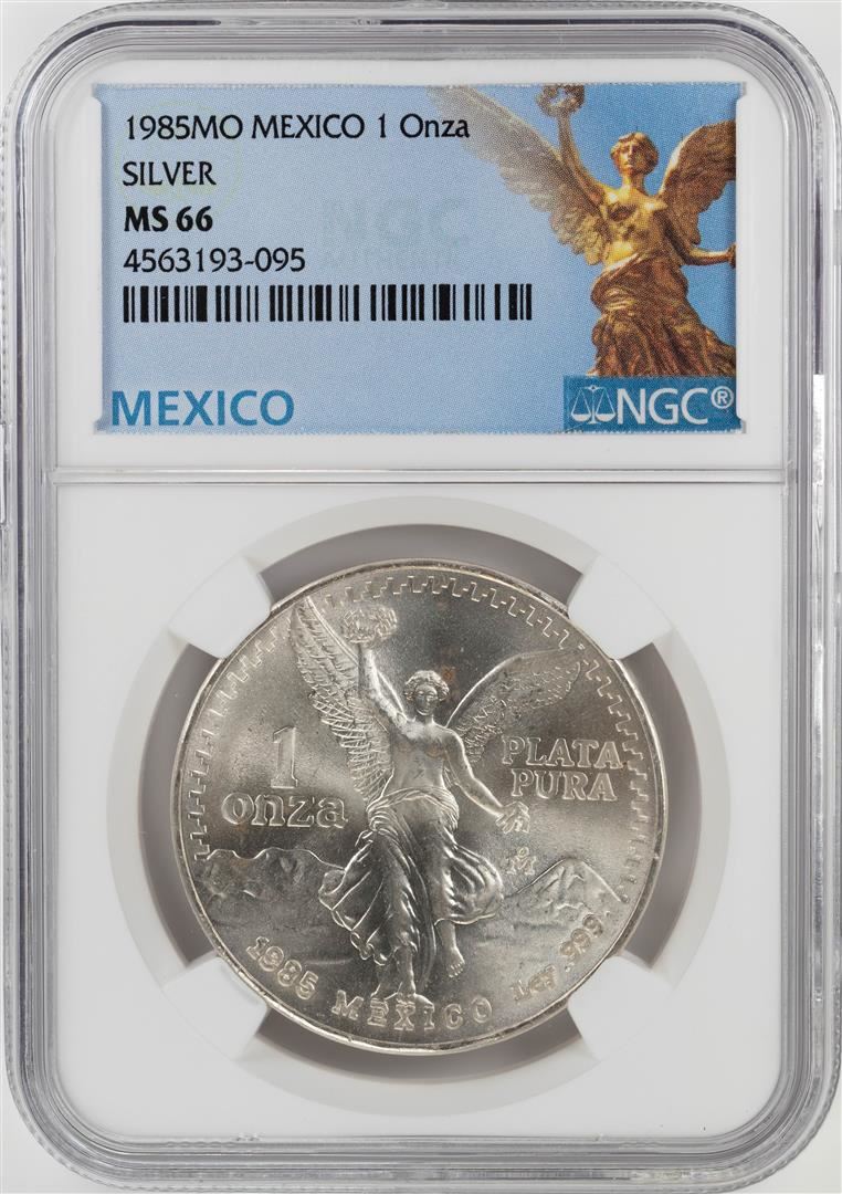 One 1985Mo Mexico 1 Onza Libertad Silver Coin NGC MS66. NGC Certified.