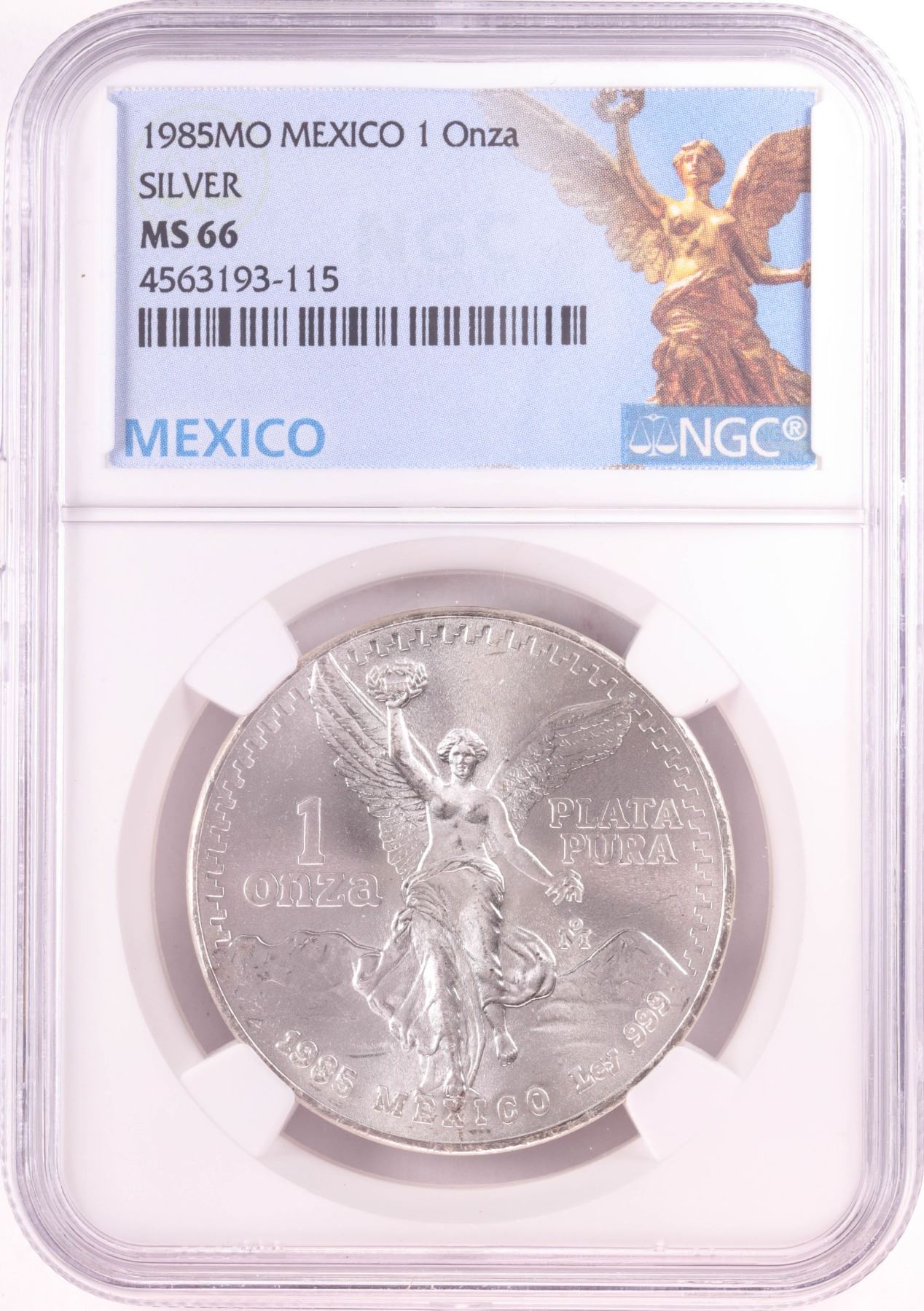 One 1985Mo Mexico 1 Onza Libertad Silver Coin NGC MS66.