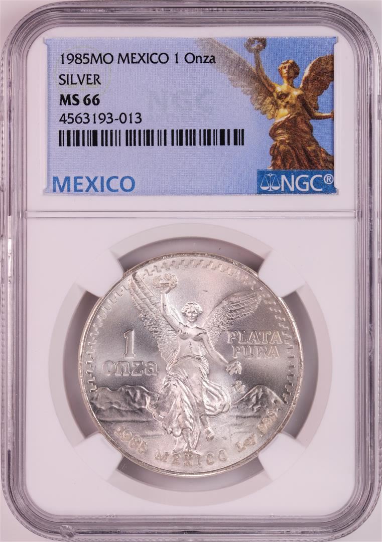 One 1985Mo Mexico 1 Onza Libertad Silver Coin NGC MS66. NGC Certified.