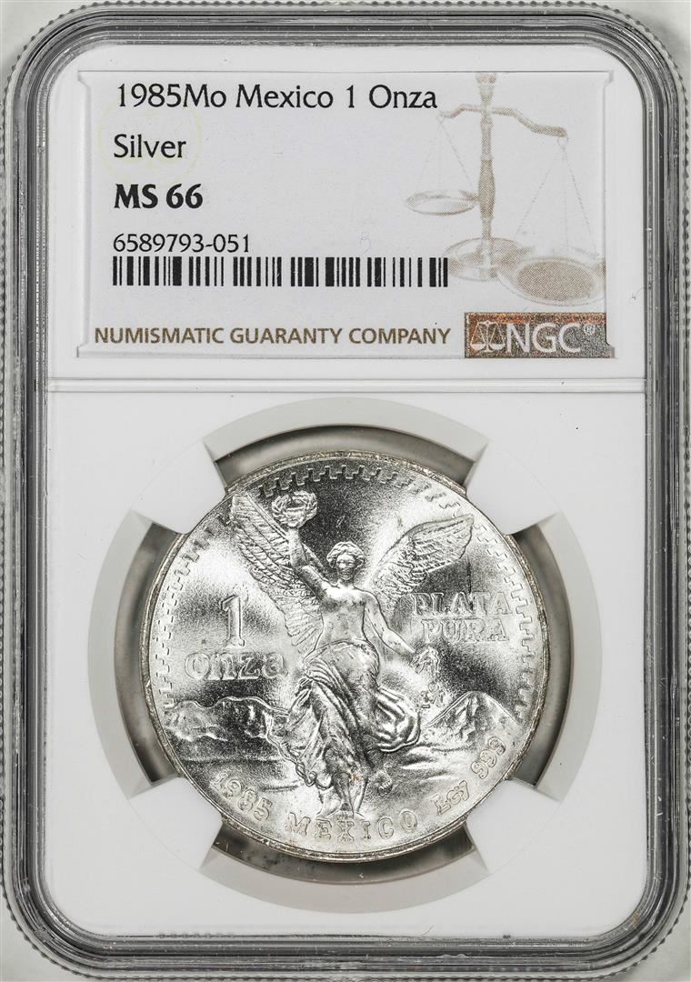 One 1985Mo Mexico 1 Onza Libertad Silver Coin NGC MS66. NGC Certified.