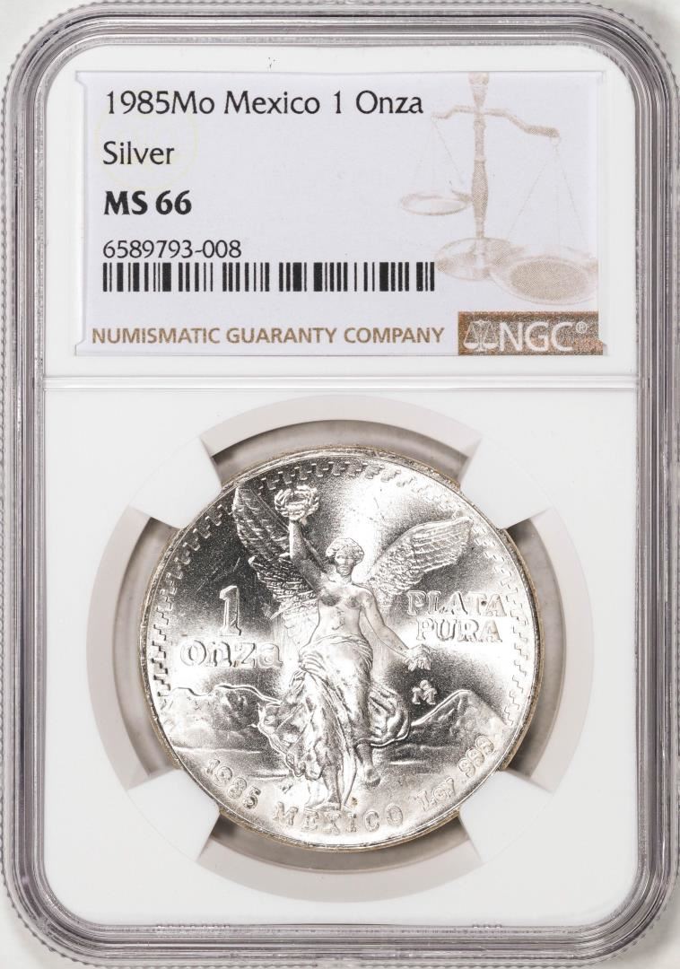 One 1985Mo Mexico 1 Onza Libertad Silver Coin NGC MS66. NGC Certified.