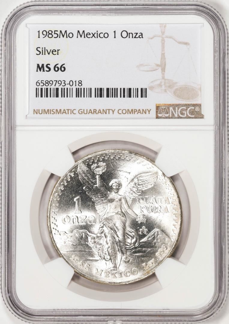 One 1985Mo Mexico 1 Onza Libertad Silver Coin NGC MS66. NGC Certified.