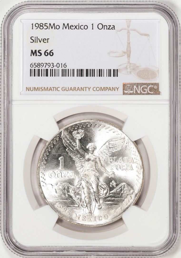 One 1985Mo Mexico 1 Onza Libertad Silver Coin NGC MS66. NGC Certified.