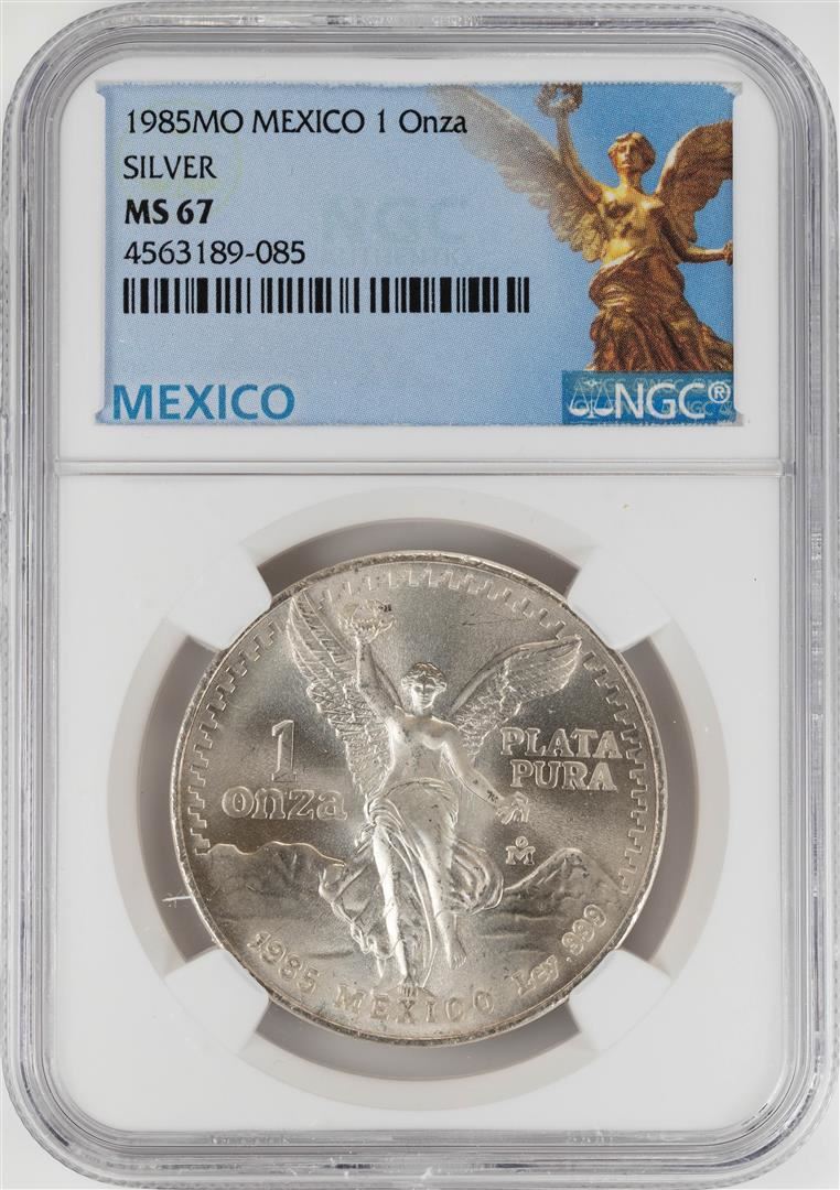 One 1985Mo Mexico 1 Onza Libertad Silver Coin NGC MS67. NGC Certified.