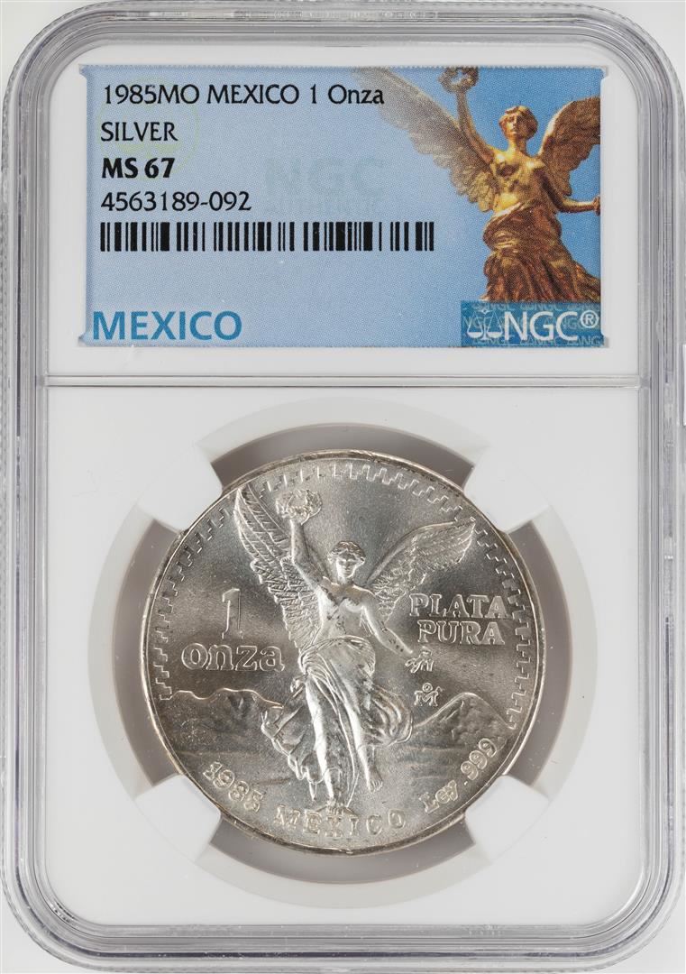 One 1985Mo Mexico 1 Onza Libertad Silver Coin NGC MS67. NGC Certified.