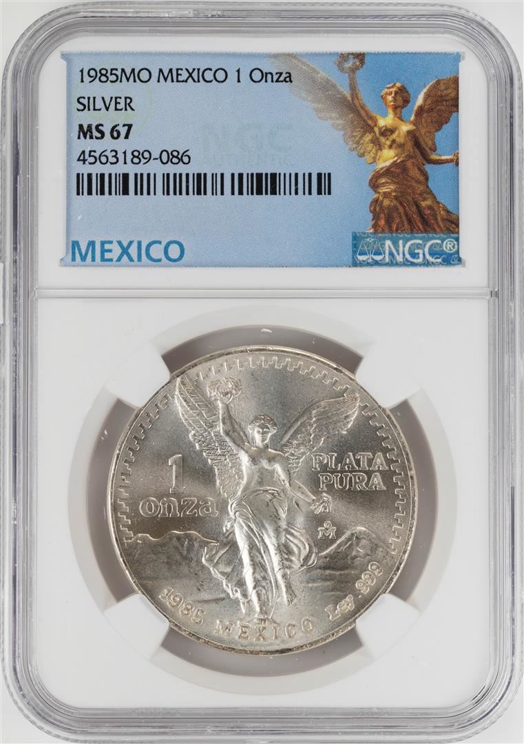 One 1985Mo Mexico 1 Onza Libertad Silver Coin NGC MS67. NGC Certified.