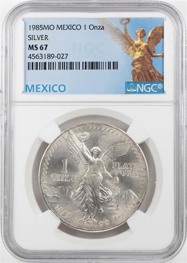 One 1985Mo Mexico 1 Onza Libertad Silver Coin NGC MS67. NGC Certified.