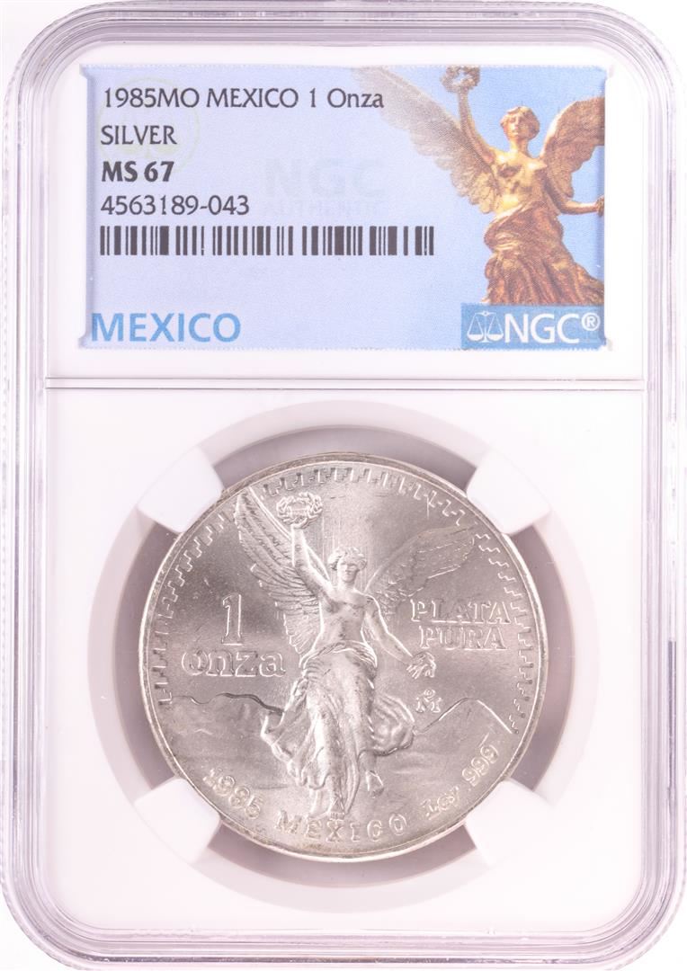 One 1985Mo Mexico 1 Onza Libertad Silver Coin NGC MS67. NGC Certified.