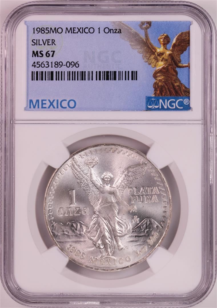 One 1985Mo Mexico 1 Onza Libertad Silver Coin NGC MS67. NGC Certified.