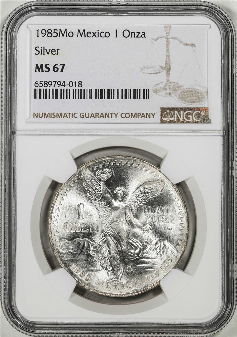One 1985Mo Mexico 1 Onza Libertad Silver Coin NGC MS67. NGC Certified.