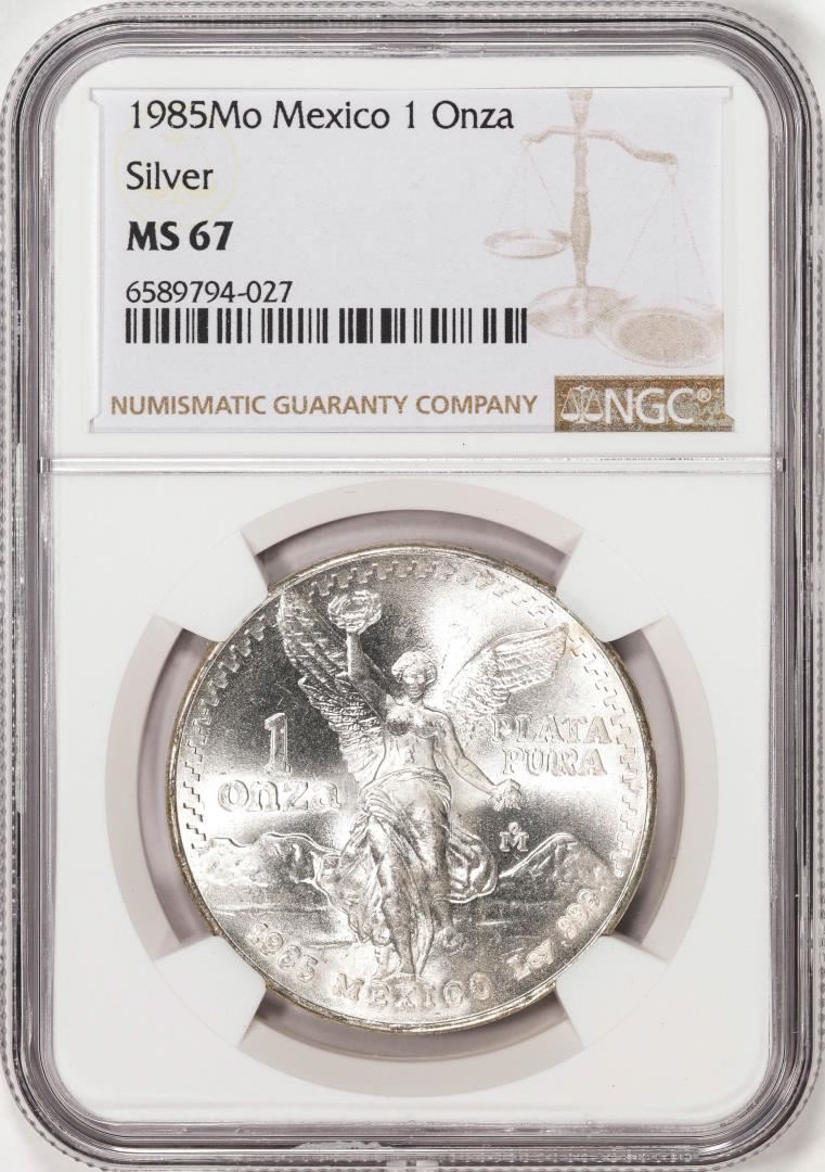 One 1985Mo Mexico 1 Onza Libertad Silver Coin NGC MS67. NGC Certified.