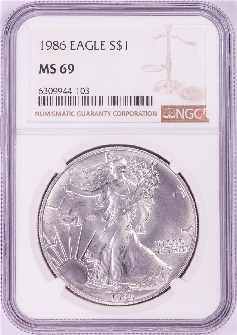 One 1986 $1 American Silver Eagle Coin NGC MS69. NGC Certified.