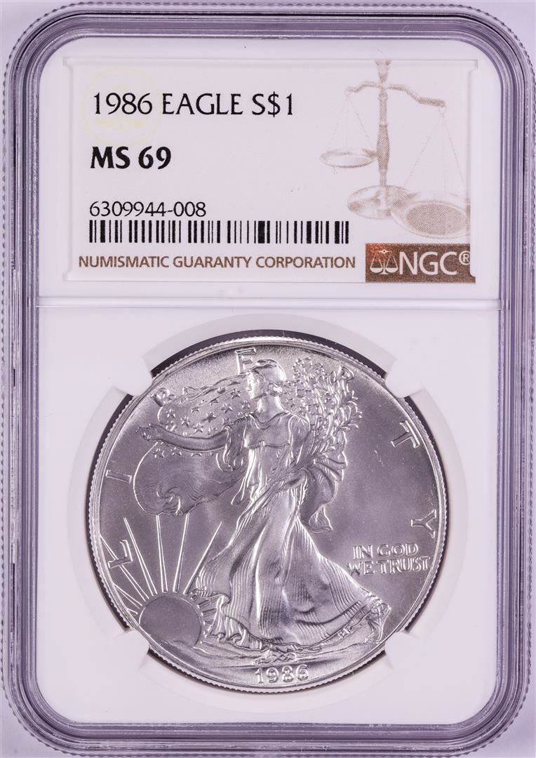 One 1986 $1 American Silver Eagle Coin NGC MS69. NGC Certified.