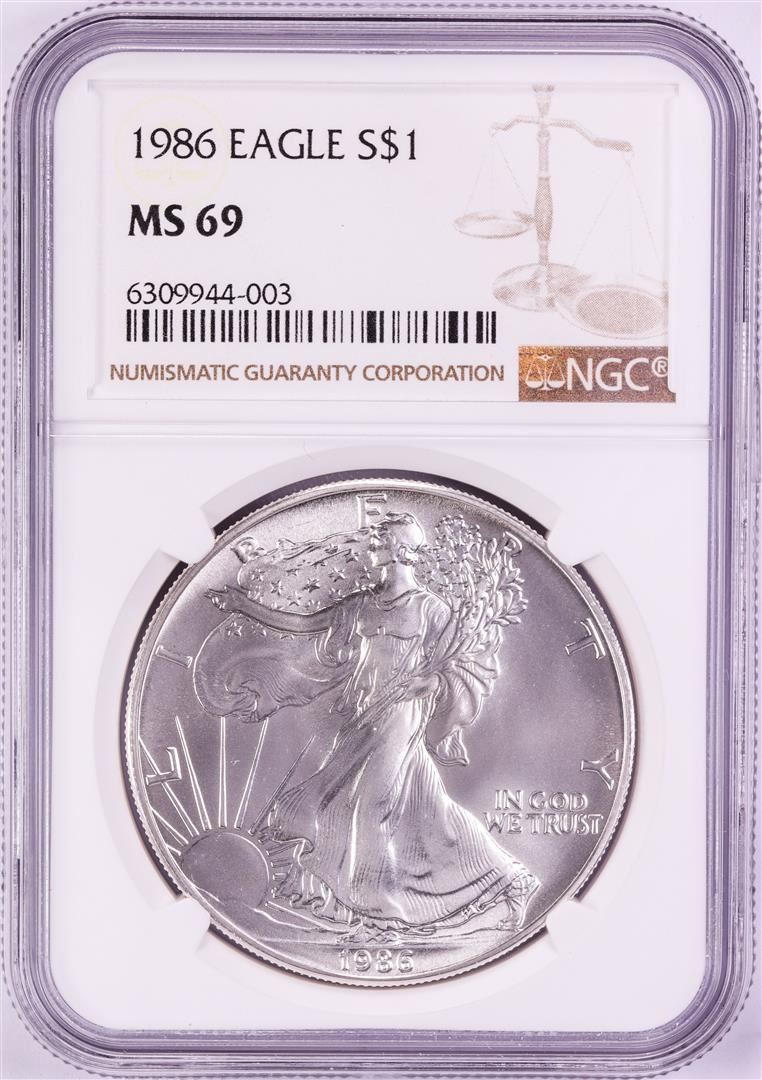 One 1986 $1 American Silver Eagle Coin NGC MS69. NGC Certified.