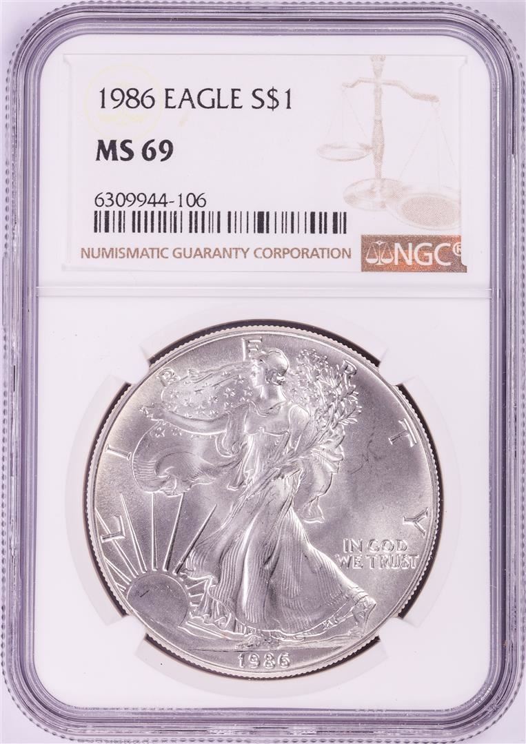 One 1986 $1 American Silver Eagle Coin NGC MS69. NGC Certified.