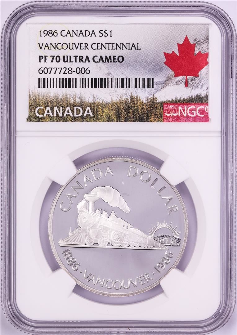 One 1986 $1 Canada Proof Vancouver Centennial Silver Dollar Coin NGC PF 70 Ultra Cameo. NGC Certified.
