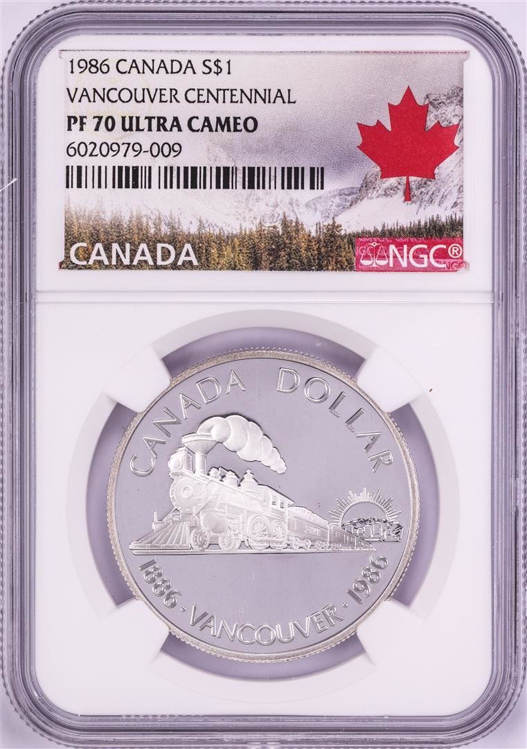 One 1986 $1 Canada Proof Vancouver Centennial Silver Dollar Coin NGC PF 70 Ultra Cameo. NGC Certified.