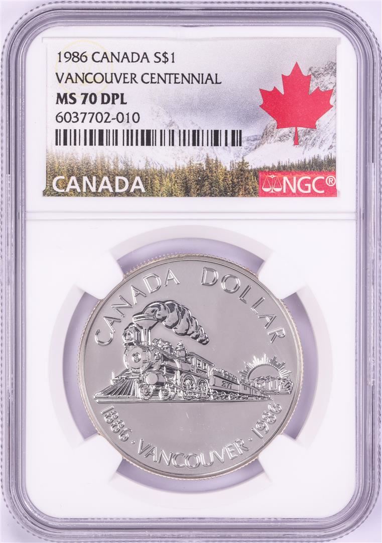 One 1986 $1 Canada Vancouver Centennial Silver Dollar Coin NGC MS70 DPL. NGC Certified.