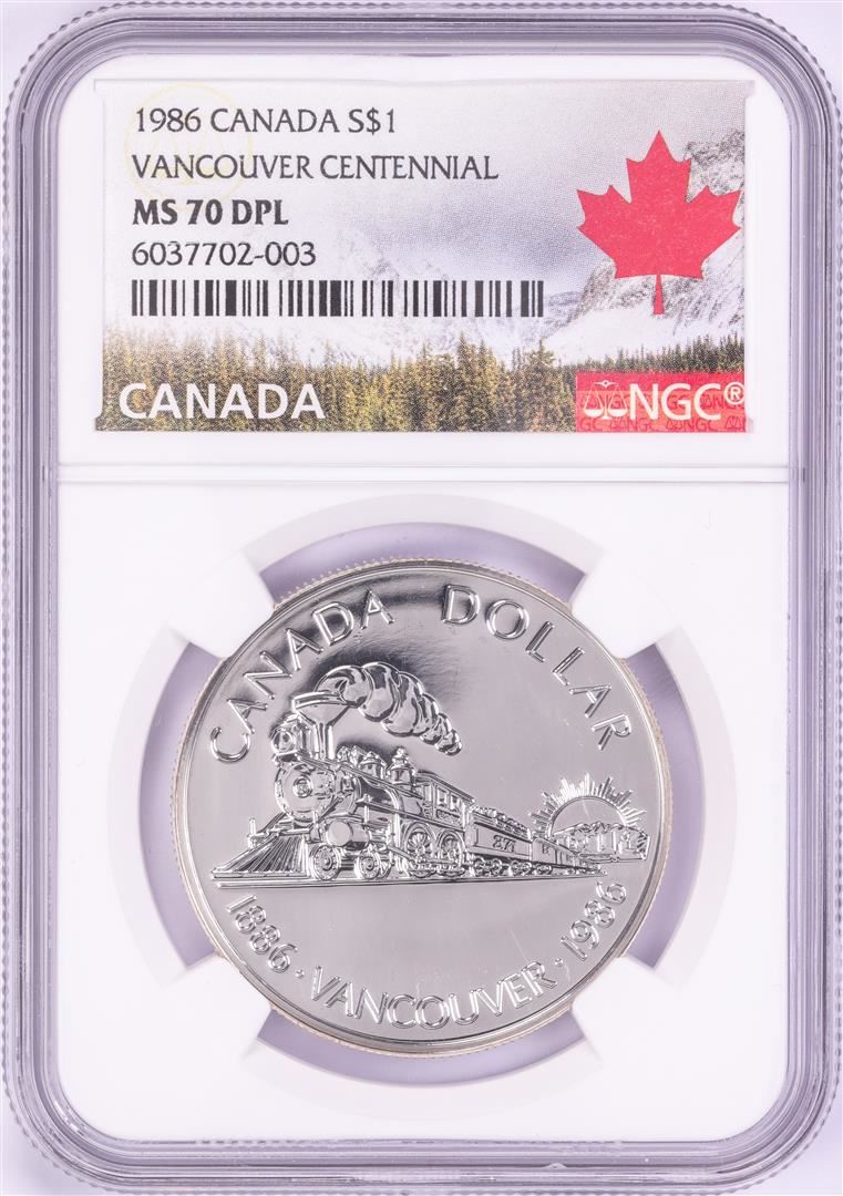 One 1986 $1 Canada Vancouver Centennial Silver Dollar Coin NGC MS70 DPL. NGC Certified.