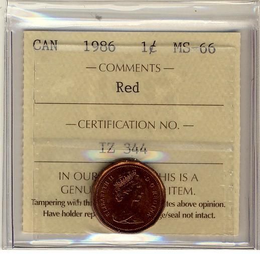 1986 1¢ ICCS MS66 Full Red, A superb GEM example.
