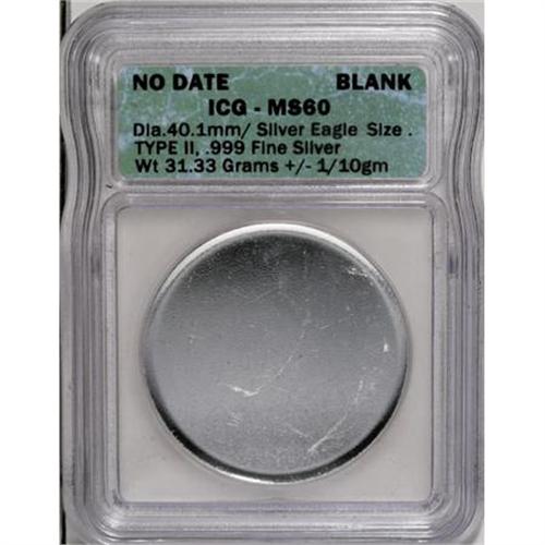 <B>Type Two Silver Eagle Size Planchet MS60 ICG.</B></I> 40.1 mm. 31.33 gm. 999 Fine silver. A custom wooden case is included.<BR><BR><b>Shipping:</b> Coins & Currency (<a target="_blank" href="http://www.heritageauctions.com/common/shipping.php">view shipping information</a>)