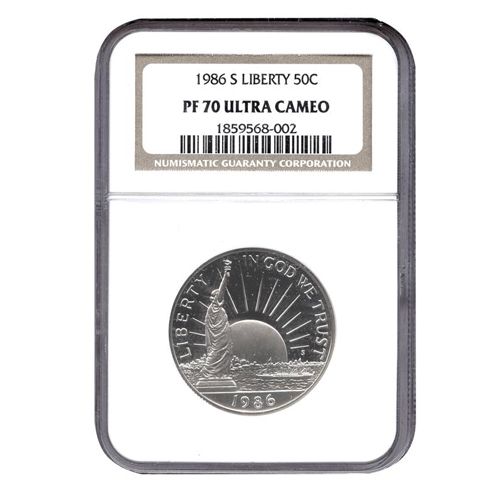 This Silver coin celebrates the 100th anniversary of the dedication of the Statue of Liberty. The obverse of this Silver dollar features the Statue of Liberty with the main building of Ellis Island in the background. The reverse shows a close up of the torch held in the Statue of Liberty's hand.