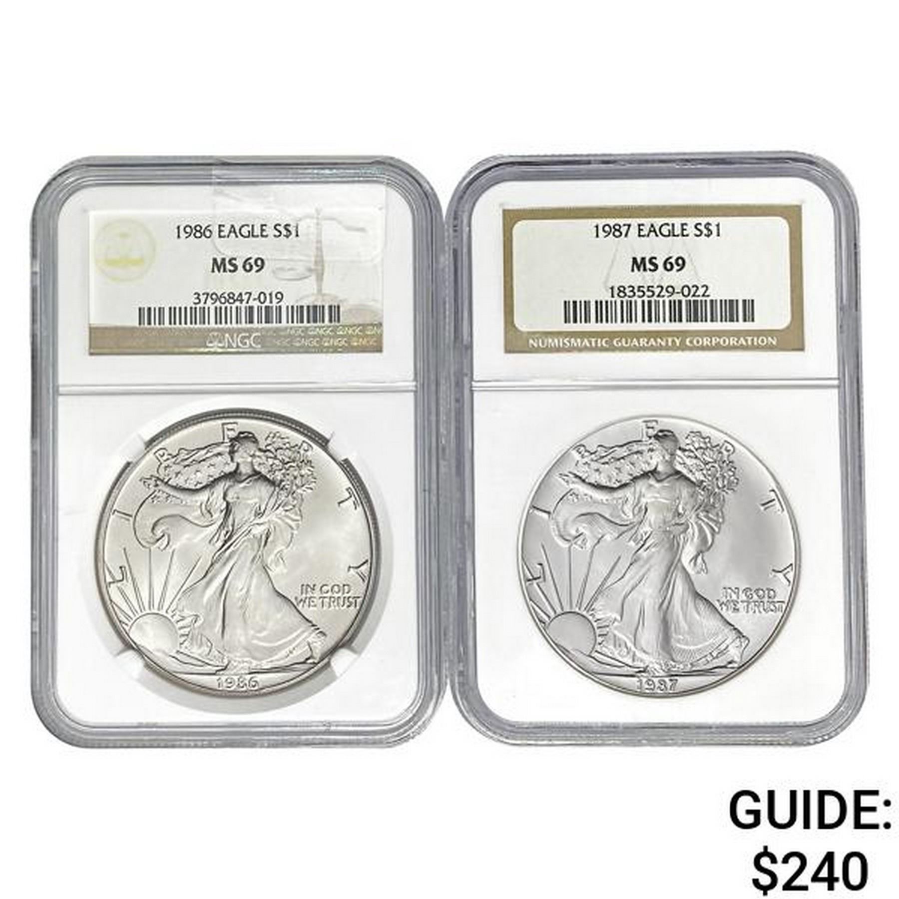 1986 /1987 Silver Eagle $1 NGC MS69 [2 Coins]