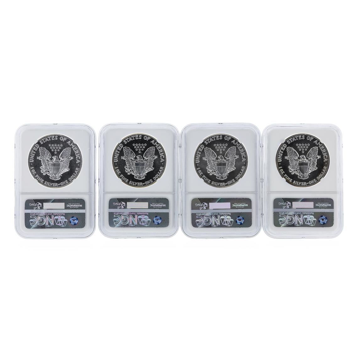 One 1986-1989 NGC MS69 $1 American Silver Eagle Coin Set. The set features a 1986 NGC MS69 $1 American Silver Eagle Coin, 1987 NGC MS69 $1 American Silver Eagle Coin, 1988 NGC MS69 $1 American Silver Eagle Coin, 1989 NGC MS69 $1 American Silver Eagle Coin. NGC Certified.