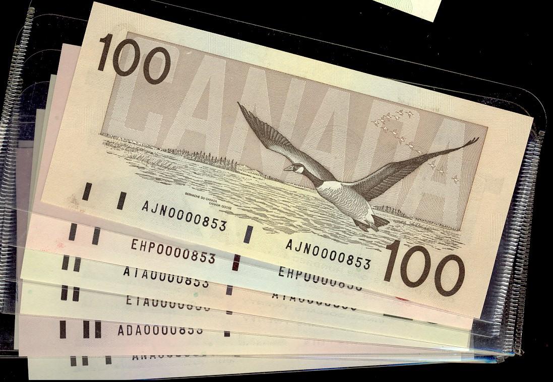 1986-1991 Bird Series Match Set. Includes 7 notes from $5 to $100 as issued at the Bank of Canada Sale. Includes 1986 $5 (2), 1989 $10, 1991 $20 (2), 1988 $50 and 1988 $100. #853. AU to UNC