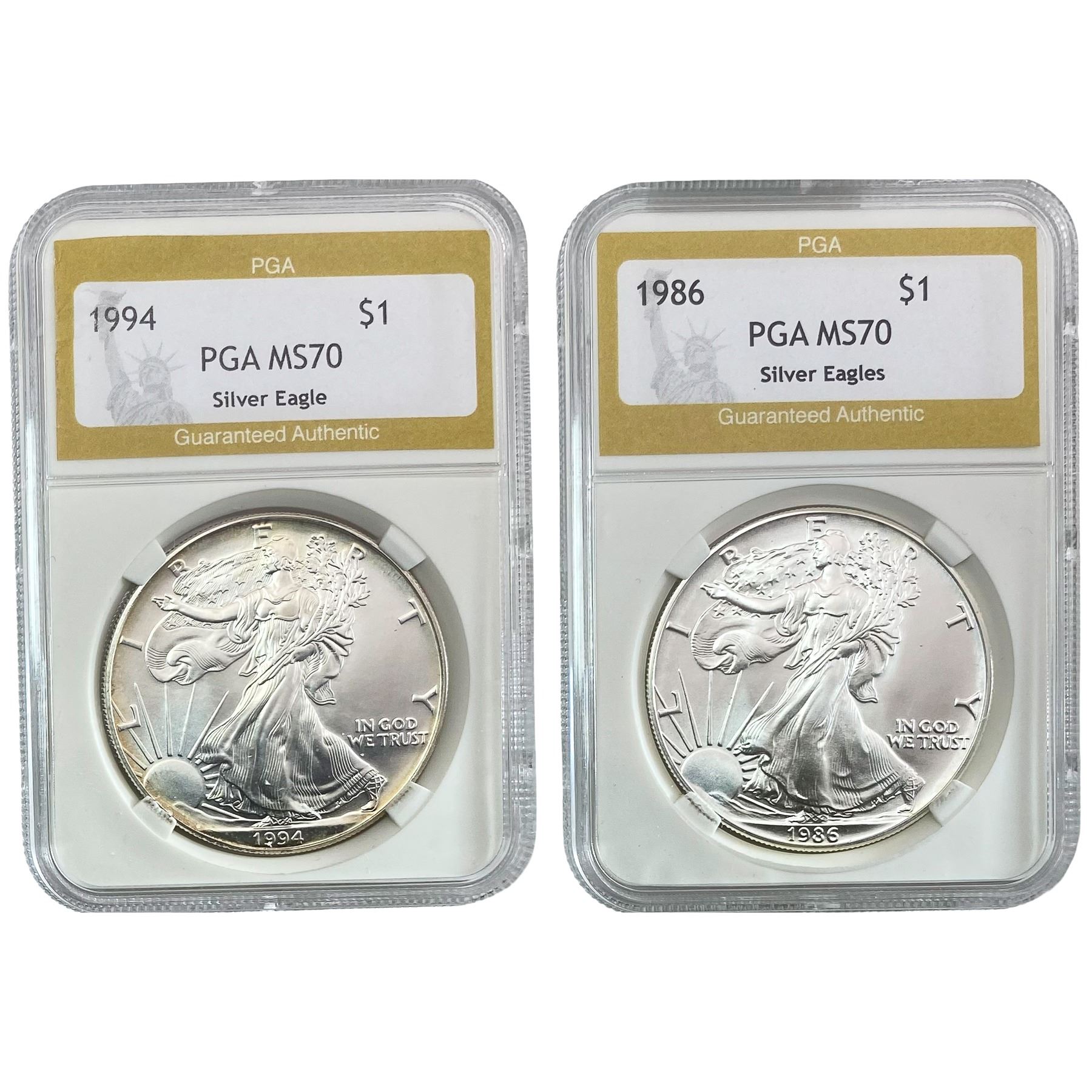 1986,1994 GEM BU Silver Eagle [2 Coins] PGA MS70