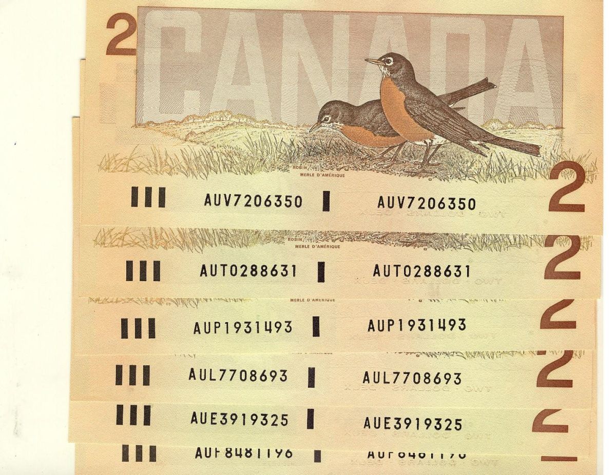 1986 $2; BC-55a AUE, AUF. BC-55b AUL, AUP, AUT, AUV. All Unc.